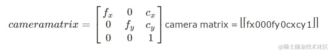 除此之外,我们还需要其他一些信息,例如相机的内在和外在参数。内部参数特定于摄像机。它们包括诸如焦距(fx,fy)(f_x,f_y)(fx,fy)和光学中心(cx,cy)(c_x,c_y)(cx,cy)之类的信息。焦距和光学中心可用于创建相机矩阵,该相机矩阵可用于消除由于特定相机镜头而引起的畸变。相机矩阵对于特定相机而言是唯一的,因此一旦计算出,就可以在同一相机拍摄的其他图像上重复使用。它表示为3x3矩阵: