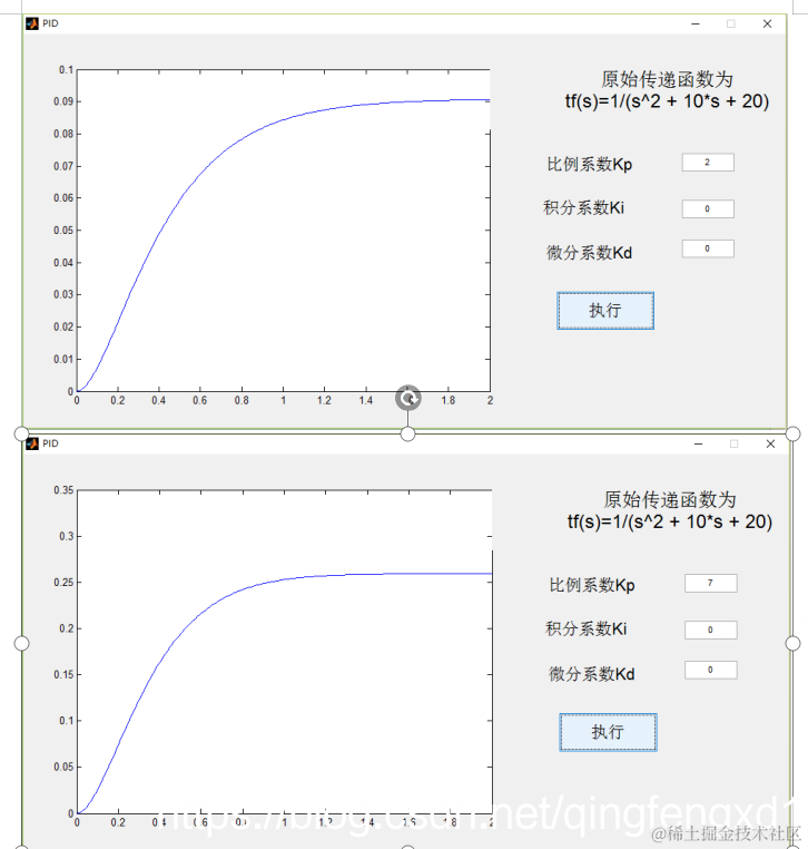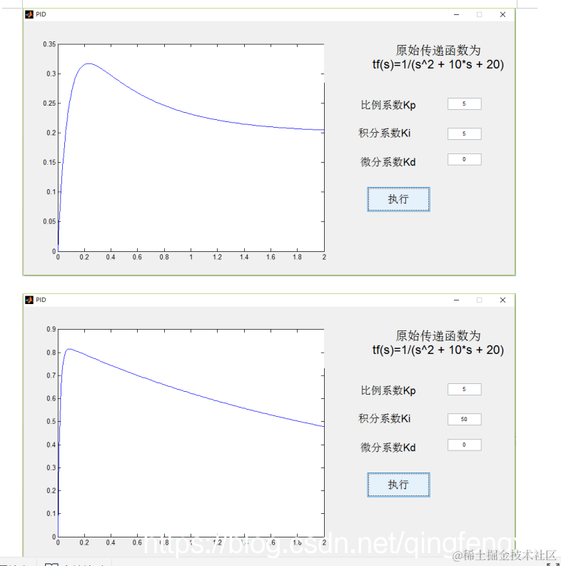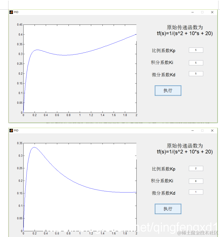 本例子中设计一个PID控制器来研究不同参数对输出结果的影响,PID控制器由比例单元 P、积分单元 I 和微分单元 D 组成。PID 控制器是一个在工业控制应用中常见的反馈回路部件,这个控制器把收集到的数据和一个参考值进行比较,然后把这个差别用于计算新的输入值,这个新的输入值的目的是可以让系统的数据达到或者保持在参考值。和其他简单的控制运算不同,PID控制器可以根据历史数据和差别的出现率来调整输入值,这样可以使系统更加准确,更加稳定。可以通过数学的方法证明,在其他控制方法导致系统有稳定误差或过程反复的情况下,一个PID反馈回路却可以保持系统的稳定。在一个PID回路中,这个纠正值有三种算法,消除目前的误差,平均过去的误差,和透过误差的改变来预测将来的误差。