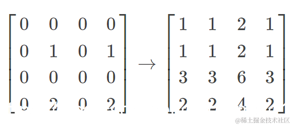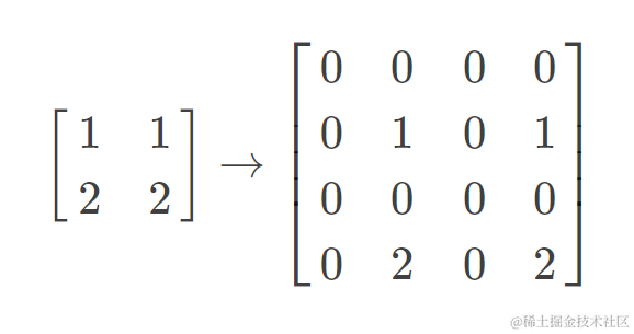 通过填充,让原来2*2的矩阵变成4*4。填充的方式是我自己根据代码给出的结果猜的,大概就是先在元素之间插strides - 1个0,然后在填充边缘使矩阵达到目标尺寸。