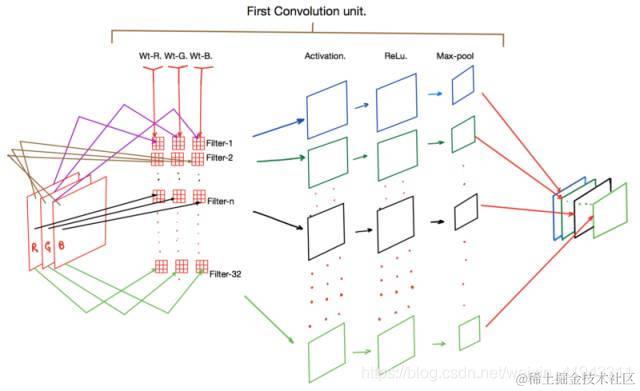 在正向传播期间,输入图片中的R、G和B像素值分别与Wt-R、Wt-G和Wt-B内核相乘以产生一个间歇激活映射(intermittent activation map)(图中未标出)。然后将三个核的输出相加,这样就为每个过滤器产生一个激活映射(Activation),一共是32个。
