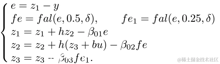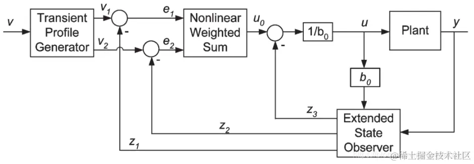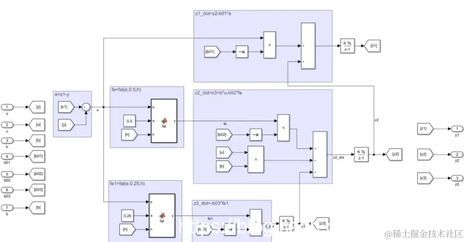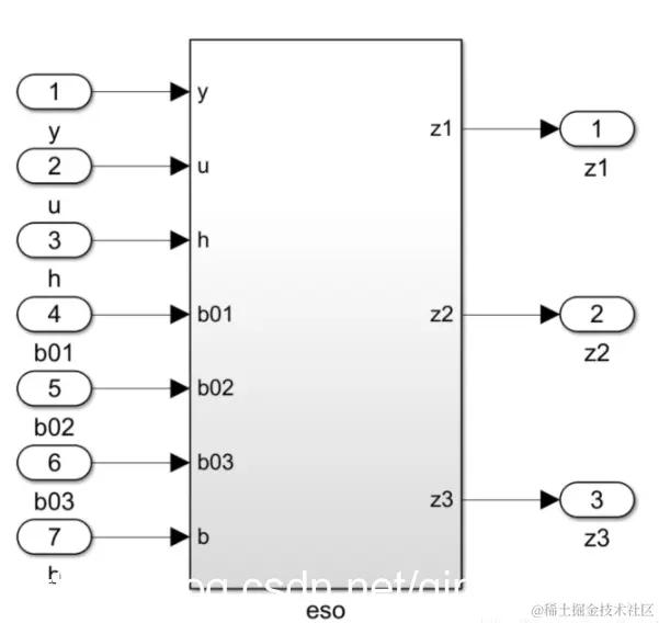 2020-12-18 Simulink实现ESO(扩张状态观测器) 算法工程师的学习日志 2021-06-17 193 阅读1分钟 Simulink实现ESO(扩张状态观测器) ADRC最核心的创新点在于ESO,与PID相比,不仅基于误差控制,还基于扰动进行控制量计算。 1、ADRC的控制框图如下:主要包括跟踪微分器(TD)、非线性状态误差反馈(NLSEF)、扩张状态观测器(ESO)。 2、ESO的公式: 3、用simulink搭建eso,如图所示: 4、将上述eso封装为subsystem,输入输出如下所示: