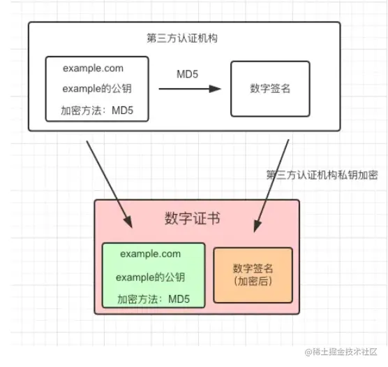这里唯一不同的是,假设对网站信息加密的算法是MD5,通过MD5加密后,「然后通过第三方机构的私钥再次对其加密,生成数字签名」。