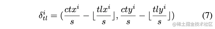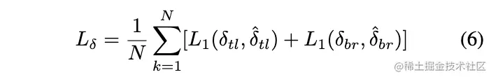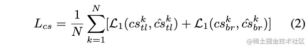 但并不是所有的边界特征都是有用的,对于左上角点而言,由于十字星的左上部边界特征在目标的外部,所以其对左上角点是相对无用的,所以论文使用偏移引导(guiding shift)来显示引导偏移值(offset field)的学习,偏移引导如图b所示。偏移值共通过三个卷积层获得,前两个卷积层转化corner pooling的输出,通过下面的损失函数有监督学习: