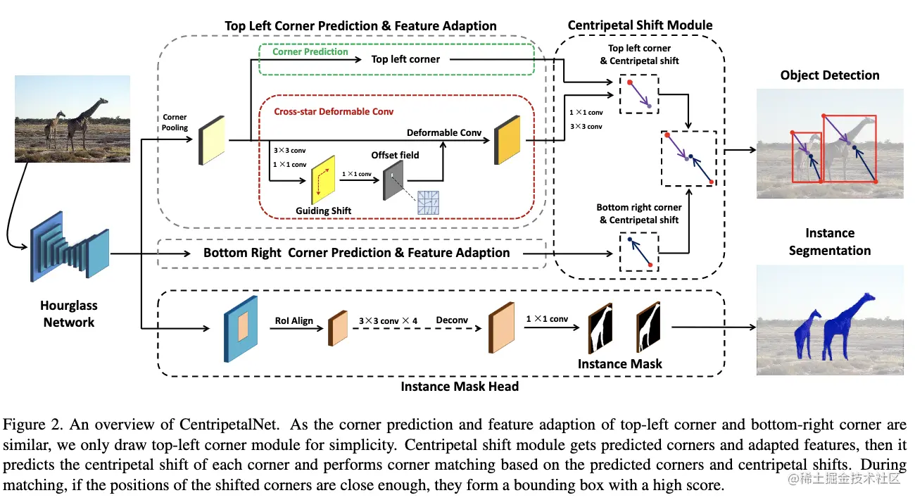 为此,论文提出了CentripetalNet,核心在于提出了新的角点匹配方式,额外学习一个向心偏移值,偏移值足够小的角点即为匹配。相对于embedding向量,这种方法更为鲁棒,解释性更好。另外,论文还提出十字星变形卷积,针对角点预测的场景,在特征提取时能够准确地采样关键位置的特征。最后还增加了实例分割分支,能够将网络拓展到实例分割任务中。