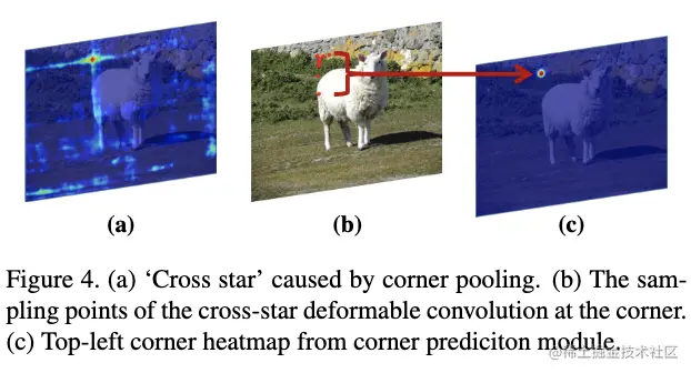 为了让角点感知目标的位置信息,coner pooling使用max和sum来进行目标信息的水平和垂直传递,导致输出的特征图存在十字星现象,如图4a所示,十字星的边界包含了丰富的上下文信息。为了进一步提取十字星边界的特征,不仅需要更大的感受域,还需要适应其特殊的几何结构,所以论文提出了十字星变形卷积。