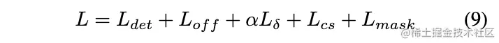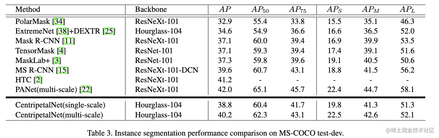 为了获取实例分割的结果,论文取soft-NMS前的检测结果作为候选框,使用全卷积网络进行mask预测。为了保证检测模块能够提供有效的候选框,先对CentripetalNet预训练几轮,然后取top-k候选框进行RoIAlign得到特征,使用连续四个卷积层提取特征,最后使用反卷积层进行上采样,训练时对每个候选框进行交叉熵损失: