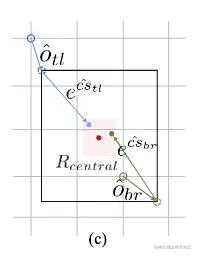 属于同一组的角点应该有足够近的中心点,所以在得到向心偏移和角点偏移后,可根据角点对应的中心点判断两个角点是否对应。首先将满足几何关系的角点组合成预测框,每个预测框的置信度为角点置信度的均值。接着,如图c所示,定义每个预测框的中心区域: