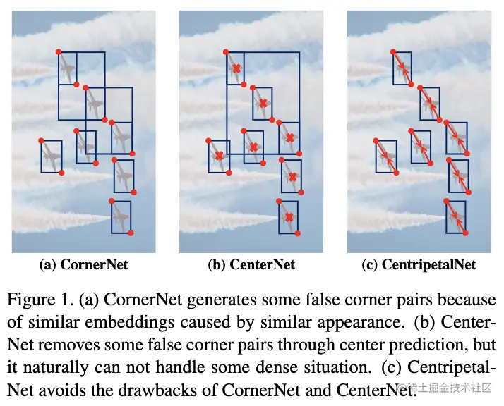 CornerNet打开了目标检测的新方式,通过检测角点进行目标的定位,在角点的匹配上,增加了额外embedding向量,向量距离较小的角点即为匹配。而论文认为,这种方法不仅难以训练,而且仅通过物体表面进行预测,缺乏目标的位置信息。对于相似物体,embedding向量很难进行特定的表达,如图1所示,相似的物体会造成错框现象。