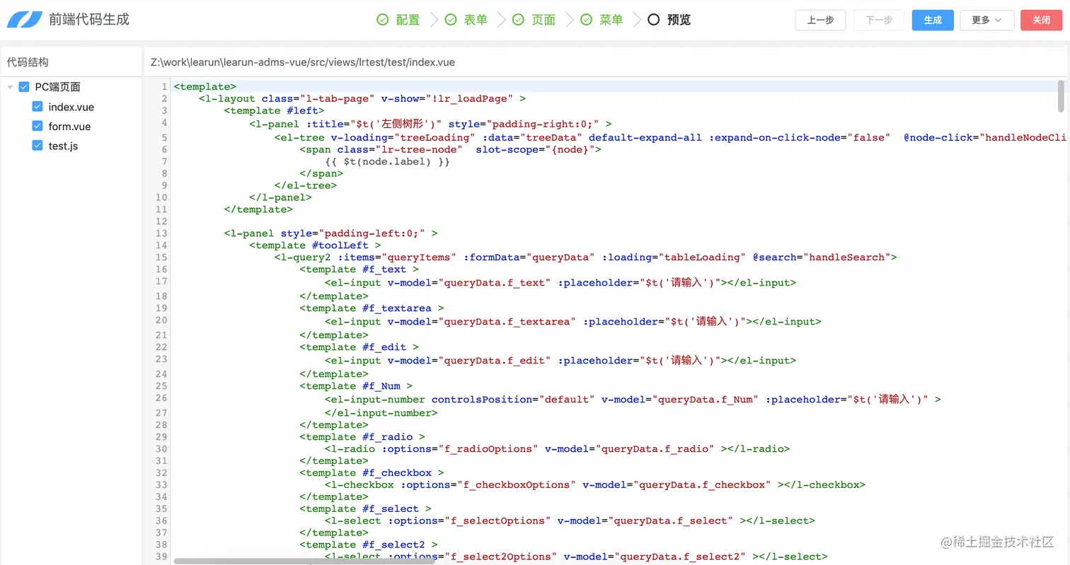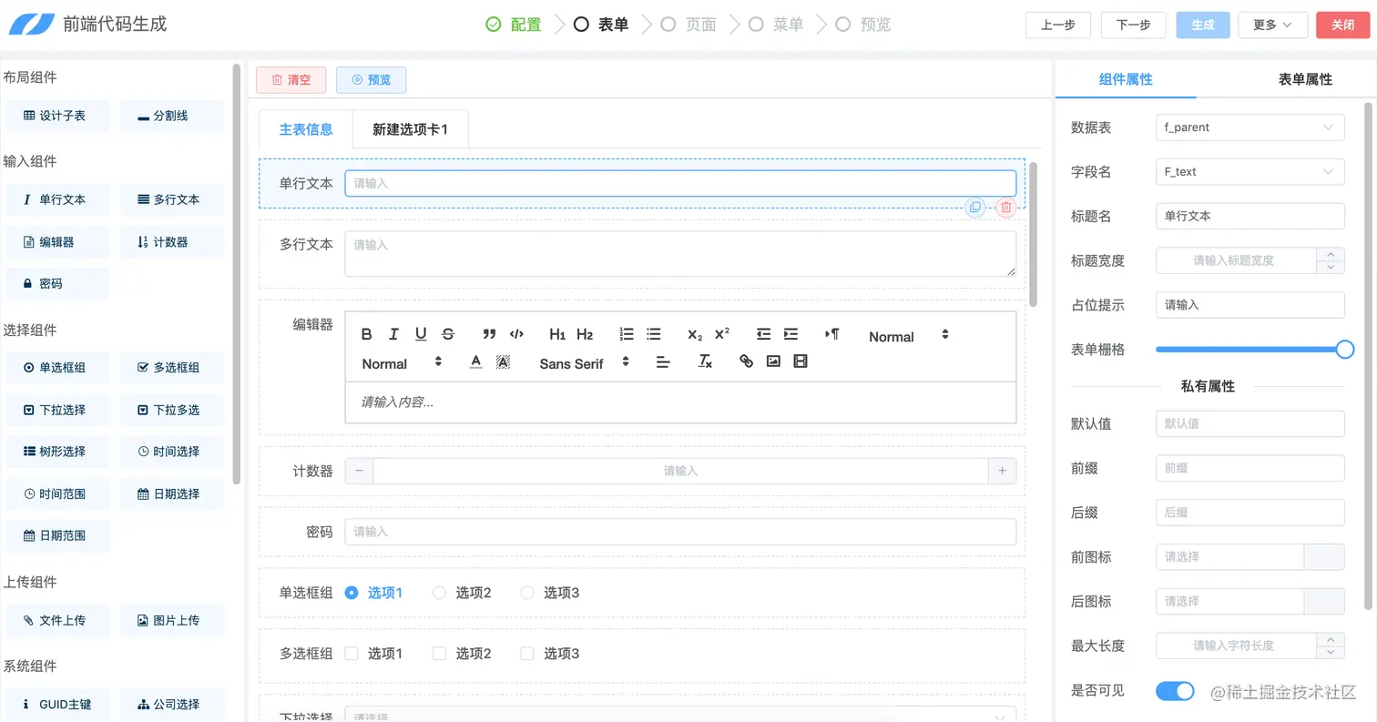 框架内置的代码生成器,在原有代码生成器的基础上进行了升级,可根据需要分别生成前后端代码。