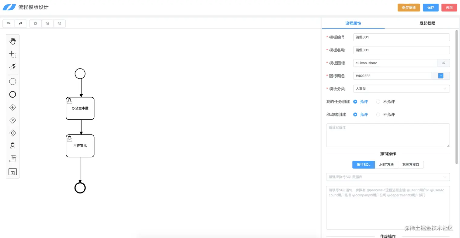 *提供工作流引擎组件,开发者可以直接在开发框架中使用自定义表单来承载业务数据进行流程审批;也可以编写代码完成复杂表单然后调用流程引擎服务进行流程审批。