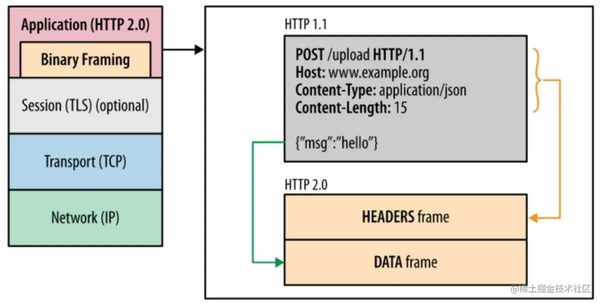http2.0并没有改变http1.x的语义,只是把原来http1.x的header和body部分用frame重新封装了一层而已,HTTP2向下兼容,需确认server是否支持2.0,这一过程一般在ssl握手阶段完成,http2叫ALPN(Application Layer Protocol Negotiation),SPDY叫NPN (Next Protocol Negotiation)。