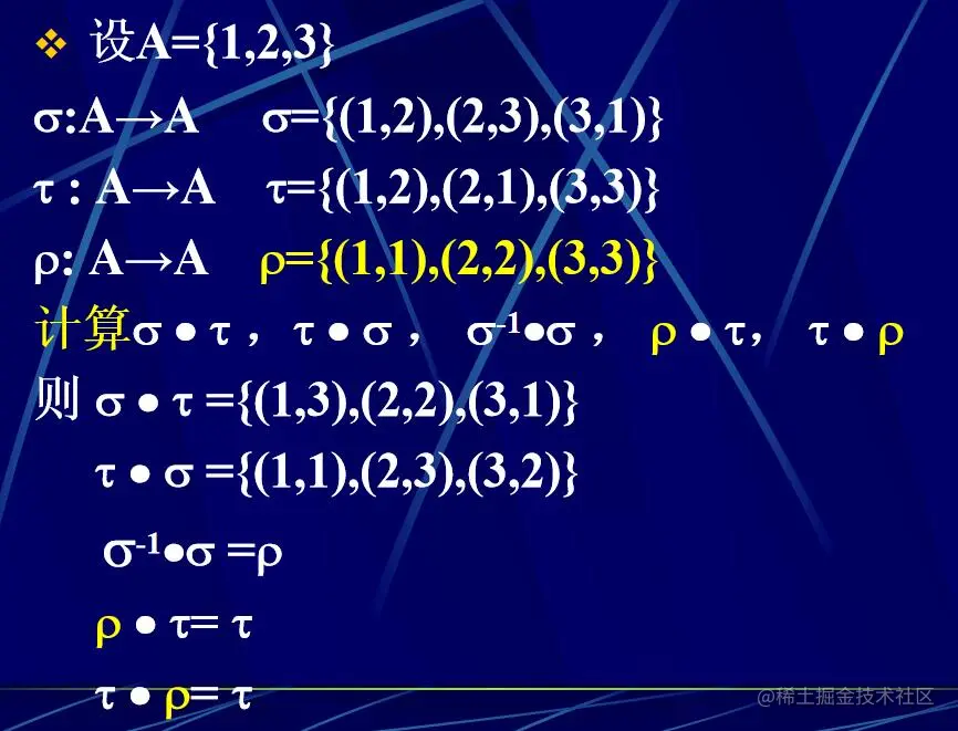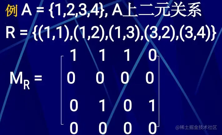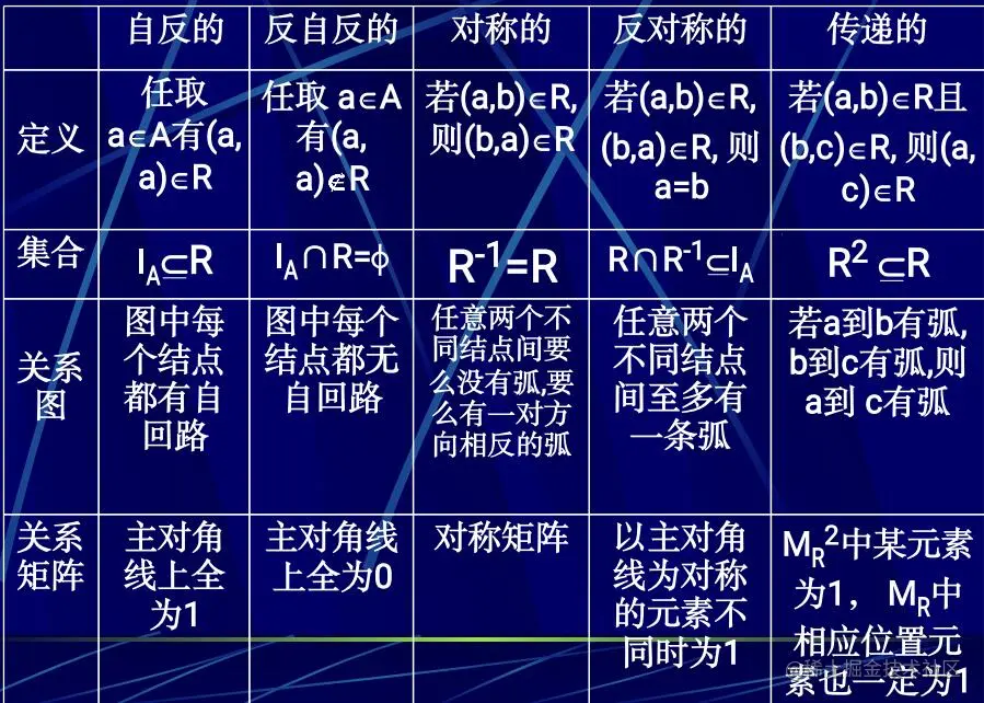 - 关系的差:R - S={(x,y)| xA, yA ,xRy并且xS/y}