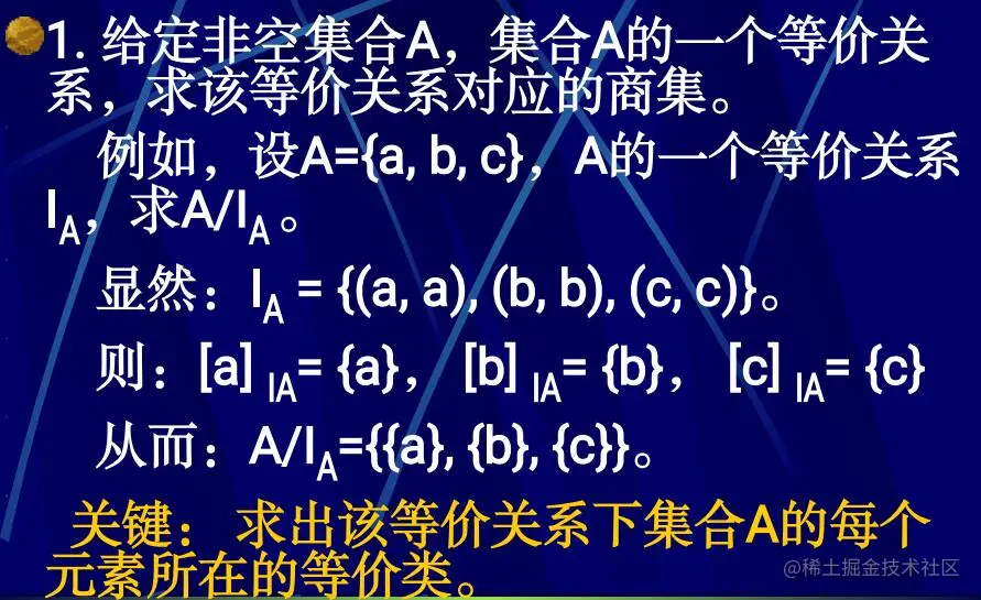 商集:设R是非空集合A上的等价关系,以R的所有不同等价类为元素作成的集合称为A关于R的商集,简称A的商集,记作A/R