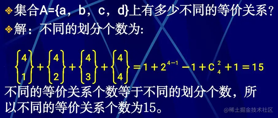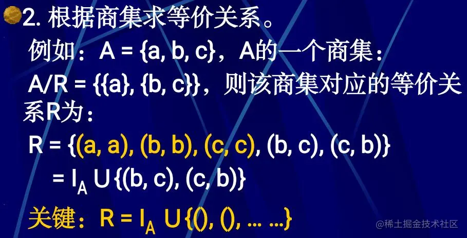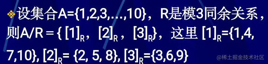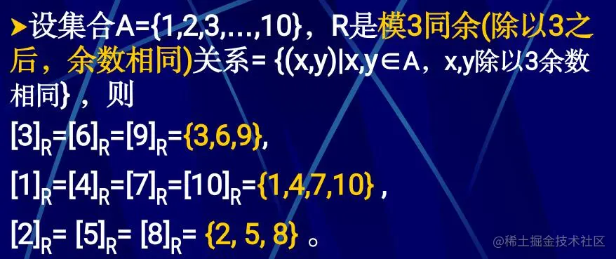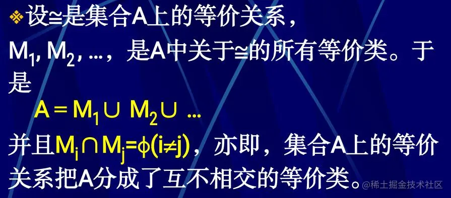 等价关系:如果R具有自反性,对称性,传递性,则称R是一个等价关系