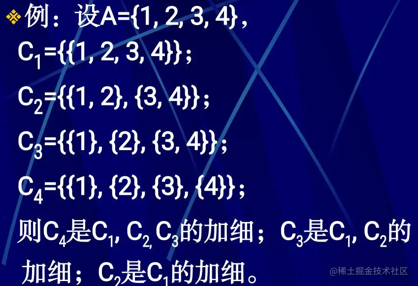 加细:设C和C'都是集合A的划分,若C的每个划分块都包含于C'的某个划分块中,则称C是 C '的加细。