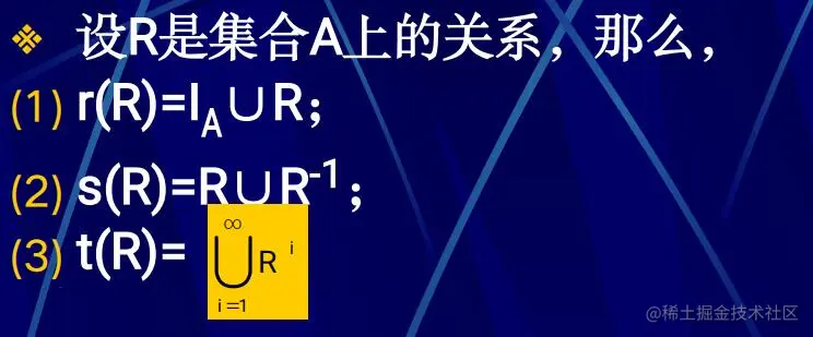 关系的闭包:R 的自反闭包、对称闭包和传递闭包分别记为r(R),s(R),t(R) ,也称r, s,t为闭包运算,它们作用于关系R后,产生包含R的最小的自反、对称、传递的关系。