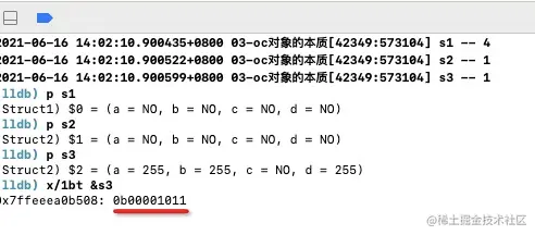 $ x/1bt &s3可得内存中二进制数据为0x00001011。低4位(从低到高)分别对应的是a、b、c、d的值;共占4个二进制位,再进行结构体的内存对齐,总大小为最大成员变量的整数倍,为1字节;
