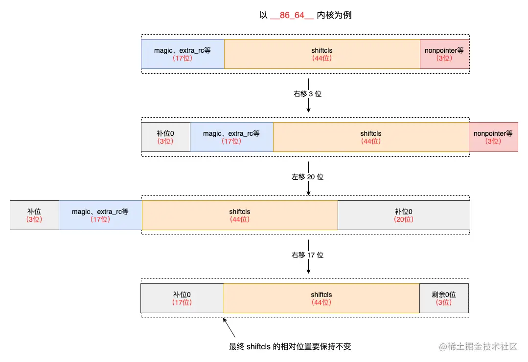 isa指针中,其中shiftcls是对应的对象信息。按位偏移是目的是只保留shiftcls信息,其它位的信息清0。最终shiftcls的相对位置要保持不变。如图:
