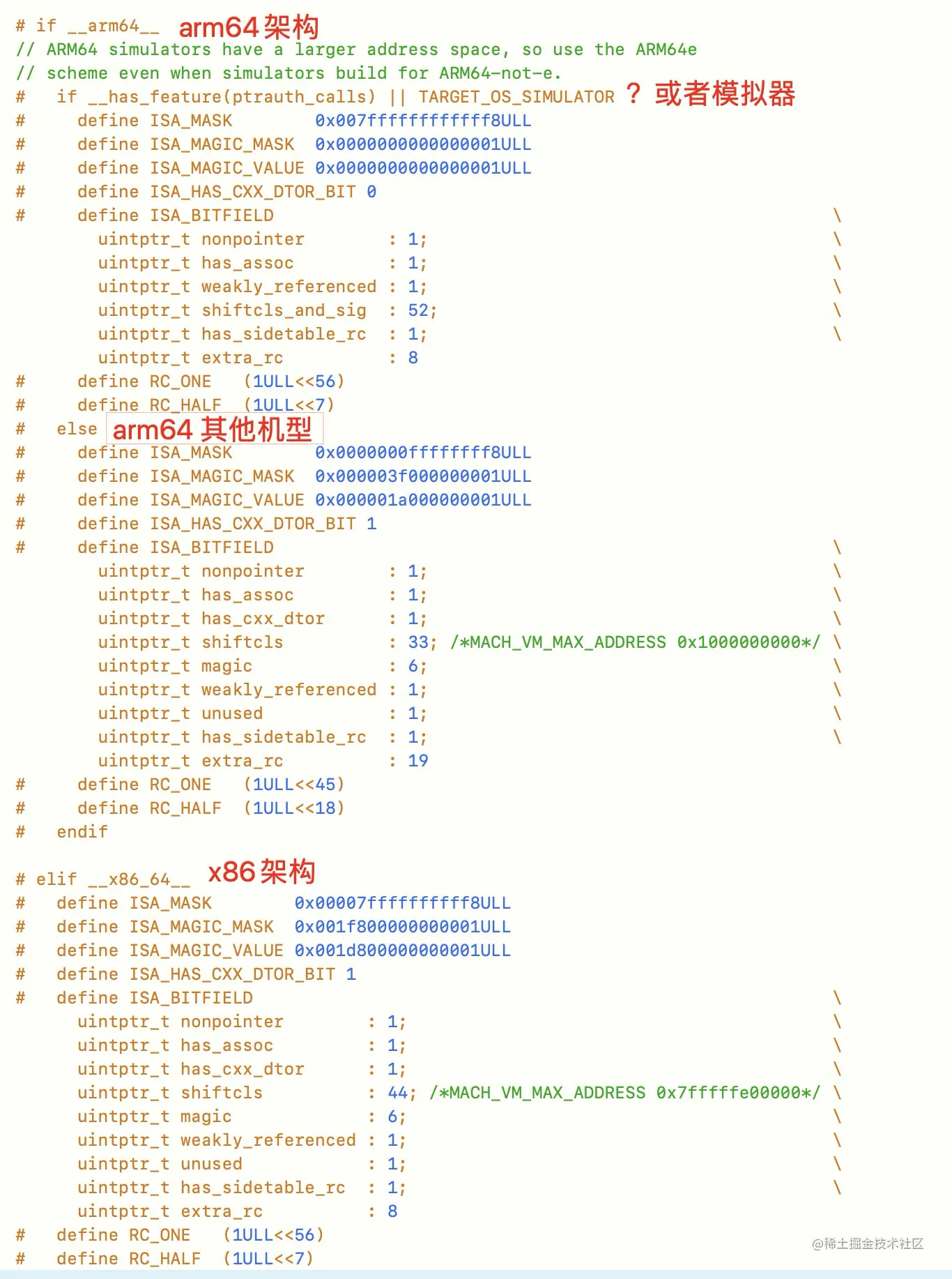 ISA_MASK为掩码,用于与isa指针地址与运算。值也是区分内核的: