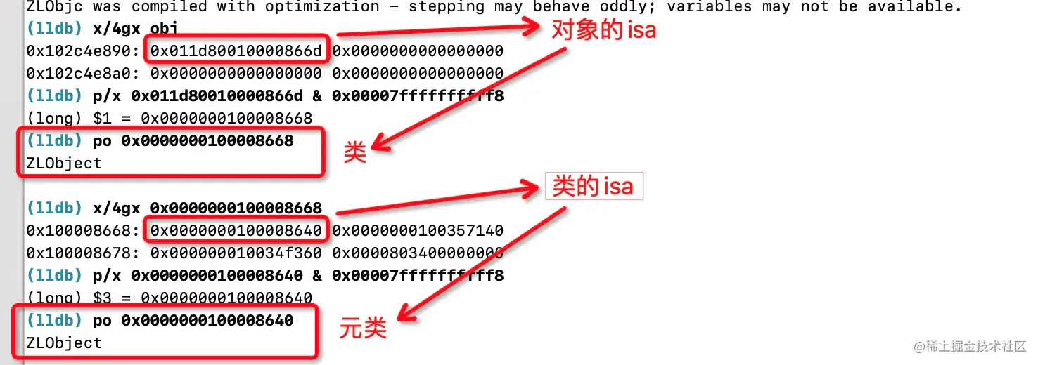 isa的结构来看,对于对象来说,没有是否释放、引用计数等字段,存储的只有元类本身,所以类的isa和元类的地址是一样。