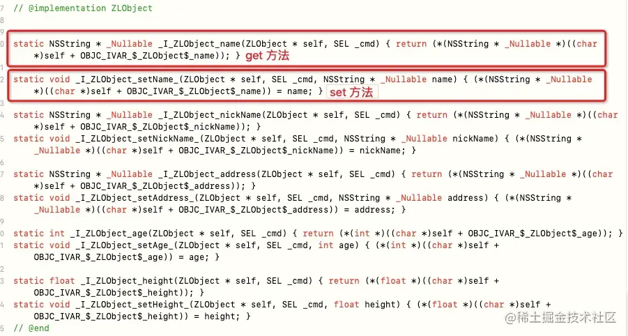get和set方法。get方法名为_I_类名_属性名,set方法名为_I_类名_set属性名_,例如:_I_ZLObject_name和_I_ZLObject_setName_。隐含参数:当前对象