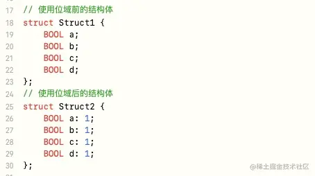 创建两个结构体,定义属性如下,一个使用位域前结构体,一个使用位域后结构体。
