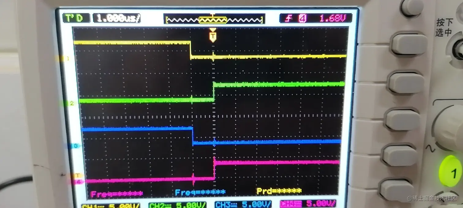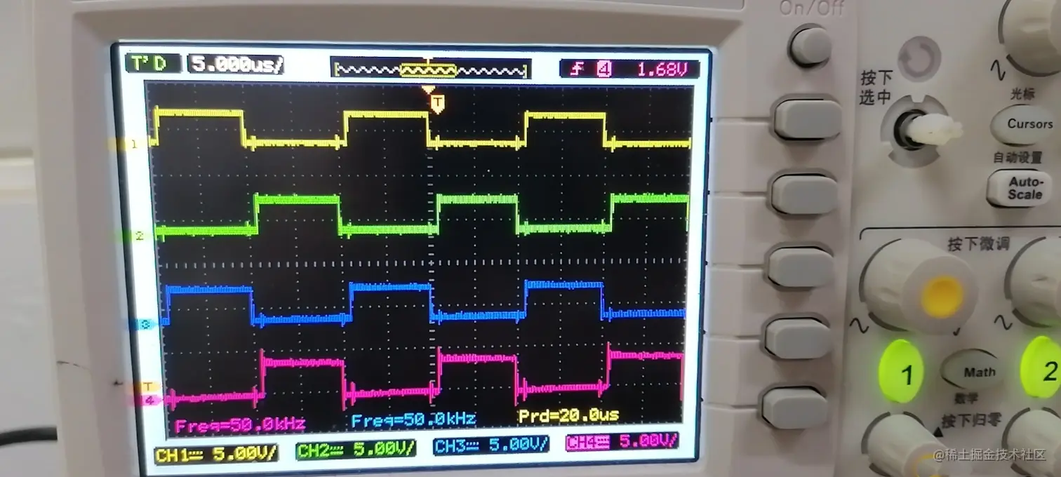 蓝色为 TIM1_CH2波形,粉色为TIM1_CH2N波形,这两个波形是通道2互补波形。