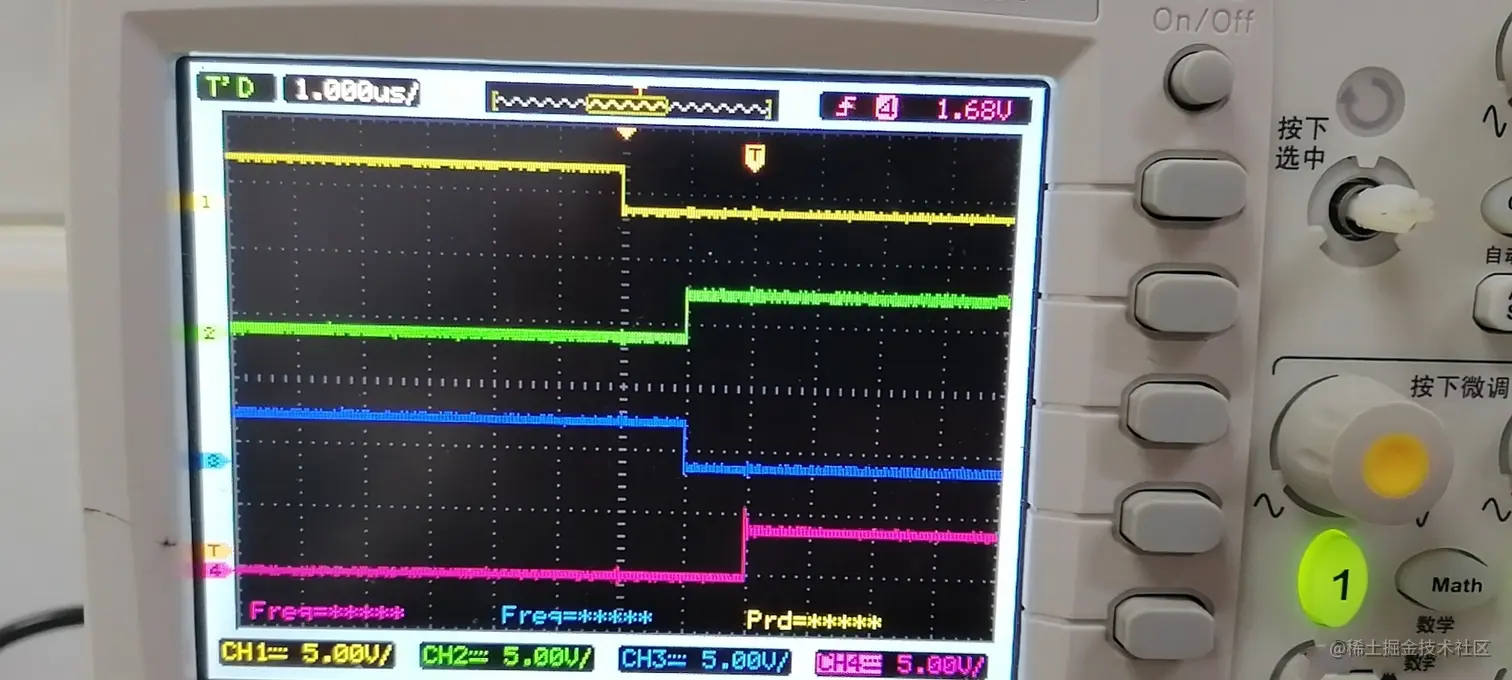 蓝色波形下降沿比黄色波形下降沿滞后了一点,说明起始相位已经发生了改变。