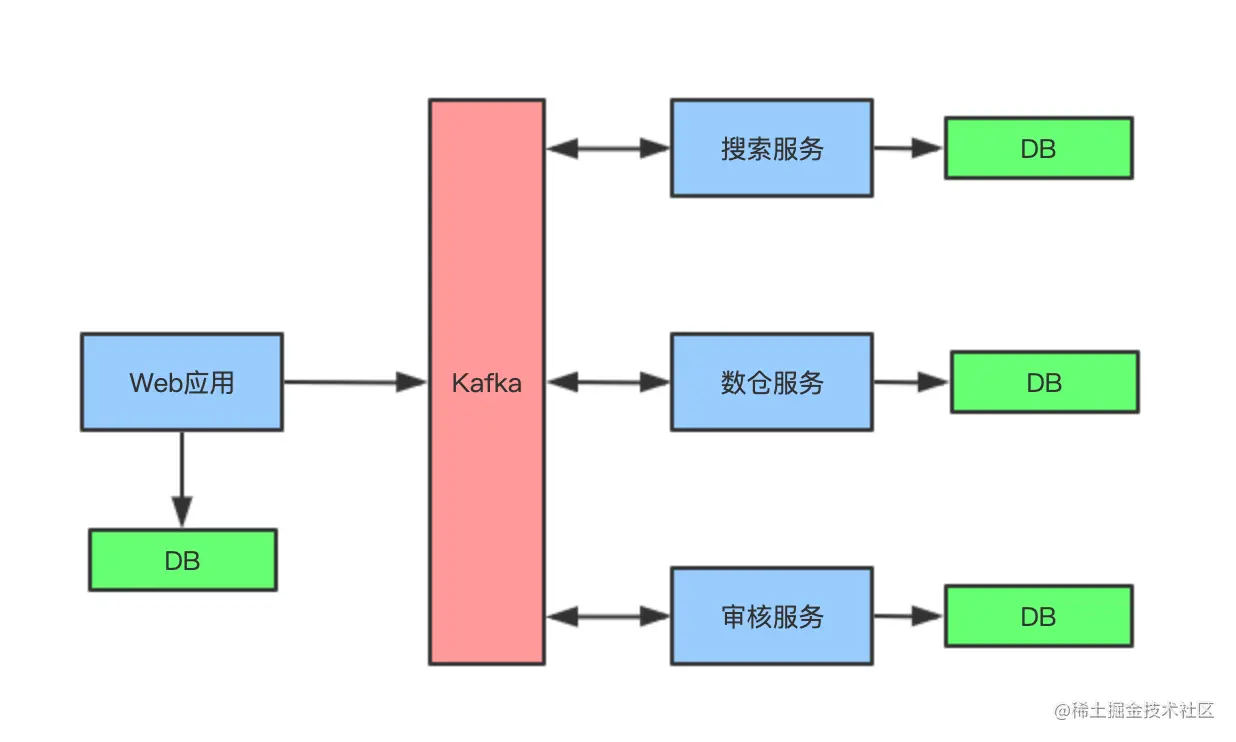 至此,我们看到每一次增加新服务,都需要对Web应用做改动。一份数据,需要在不同业务服务中根据不同业务逻辑处理流转和存储,这是我们经常遇到的,但像上图中引发的服务间强依赖,高耦合等问题,对未来服务架构的扩展和维护将是极大的挑战。
