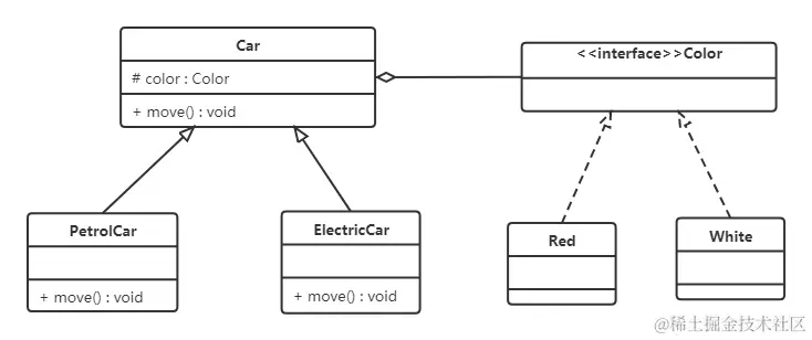 汽车按“动力源”划分可分为汽油汽车、电动汽车等;按“颜色”划分可分为白色汽车、黑色汽车和红色汽车等。如果同时考虑这两种分类,其组合就很多。类图如下: