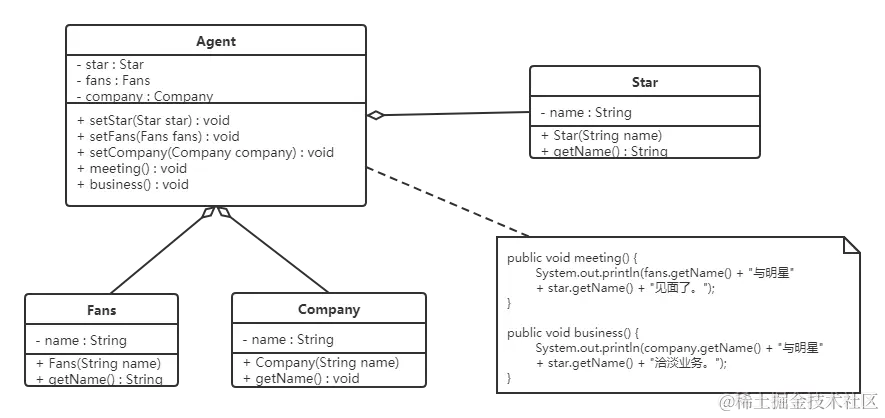 System.out.println(company.getName() + "与明星" + star.getName() + "洽淡业务。");
