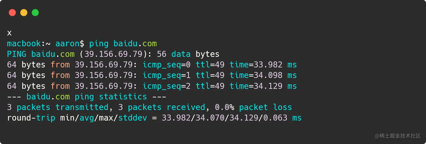DNS(Domain Name System,域名系统)是一项域名解析服务。它将域名解析成IP地址,以方便大家使用容易记忆的英文字母,来访问互联网。以下示例完成了一次解析,通过ping域名,我们可以得到其IP地址。