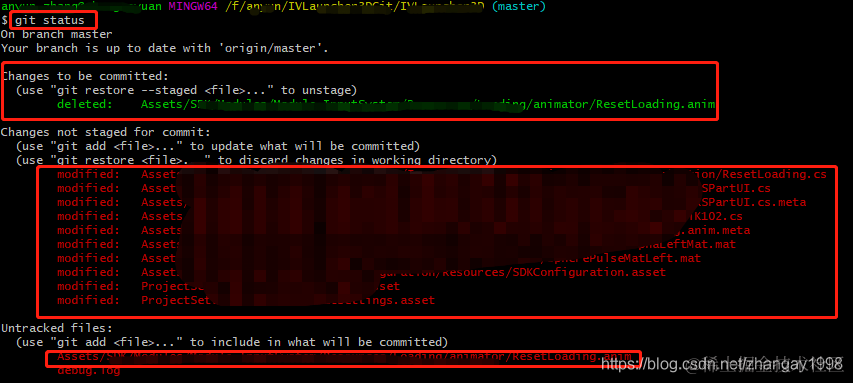从服务器上拉下来的文件,我在本地做了修改,用git status 查看后,可能会出现如下所示,第一个框绿色部分代表我进行了git add 操作的文件,但是还没有git commit。第二个框里面的代表在本地原有文件上所做的修改(还没有git add等操作)。第三个框表示新添加的文件。这个时候我进行分支切换的时候,有可能会报错,因为我修改的这几个文件有可能再另一个分支也存在,我修改了此分支的,所以不让切换到另一个分支,会发生冲突。这时候如果想切换分支,有几种方法可以参考:1.先git commit 提交到工作区 2.git checkout --[filename] (将这个文件恢复到最近一次提交的状态,慎重选择,因为这样会把本地修改的内容给删成最后提交的状态) 3.git stash (将当前工作现场“储藏”起来,等以后恢复现场后继续工作)。切回来,git stash apply 回到最新的储藏。 git stash list 显示多次的储藏,根据显示的版本回到之前的储藏。