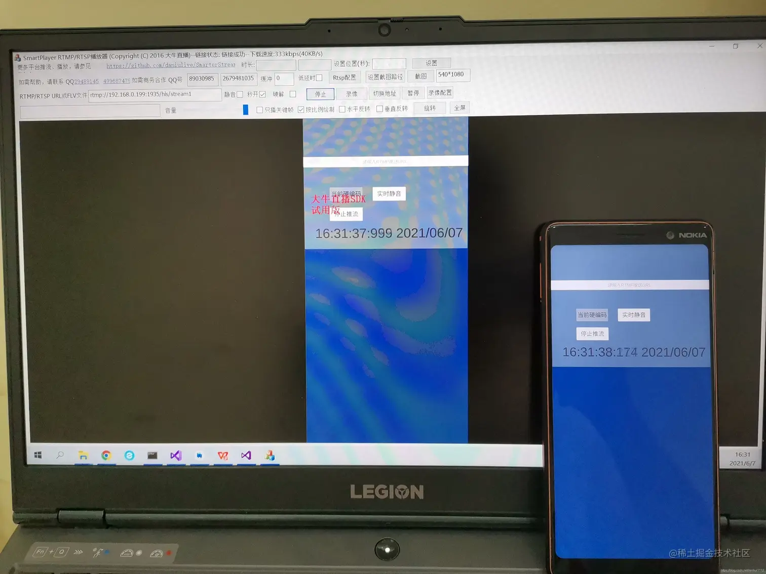 下图系Android平台Unity环境下采集屏幕,编码推送到RTMP服务器,然后Windows平台播放器拉取RTMP流播放,为了方便看到延迟效果,特地在Android端的Unity窗口显示了当前时间,可以看到,整体延迟在毫秒级: