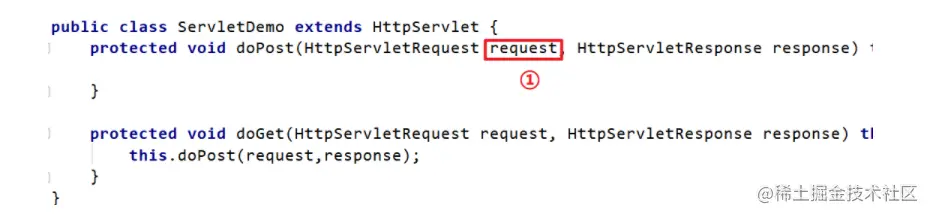 使用tomcat作为web容器时,接收浏览器发送过来的请求,tomcat会将请求信息封装成ServletRequest对象,如下图①处对象。但是大家想想ServletRequest是一个接口,它还有一个子接口HttpServletRequest,而我们知道该request对象肯定是一个HttpServletRequest对象的子实现类对象,到底是哪个类的对象呢?可以通过输出request对象,我们就会发现是一个名为RequestFacade的类的对象。
