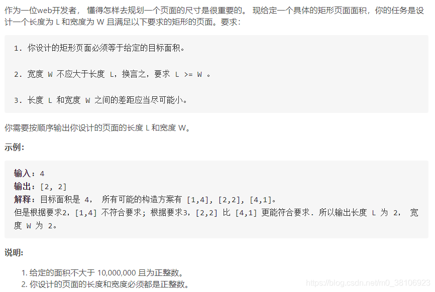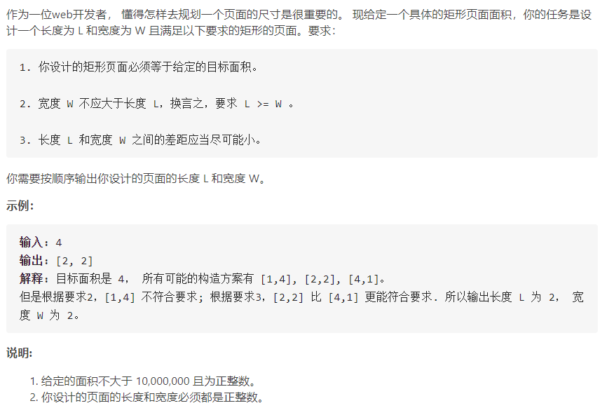 这道题主要的难点是要找到两个相近且相乘为面积的长和宽,所以用开平方求得最中间的数,然后依次递减,找到可以被整除的数,即可。