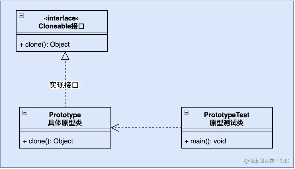- Prototype原型类, 实现了Cloneable接口, 并重写了Object的clone()方法