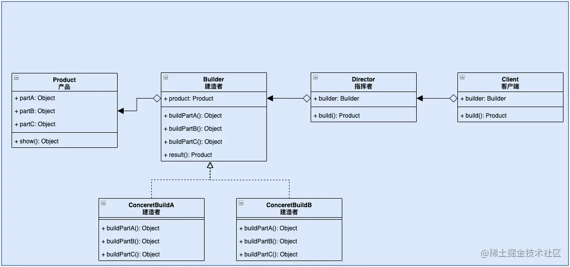 从上图可以看出, 建造者(Builder)模式由5个主要部分构成。