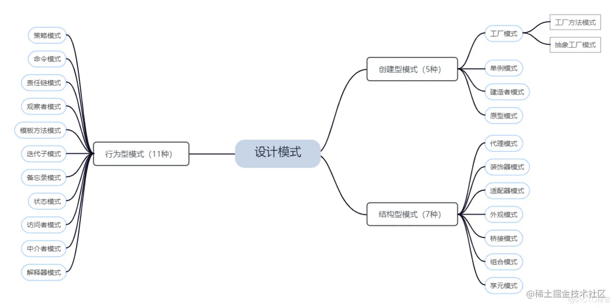 总的来说,设计模式可以分为三大类:创建型模式、结构型模式、行为型模式,具体如下图: