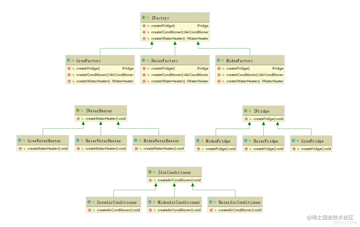 从上面一大堆的代码,尤其是类图,我们可以很明显的感觉到,抽象工厂可以完美清晰的描述海尔、格力、美的三个品牌的冰箱、空调、热水器的庞大体系。但也正因为如此,抽象工厂给我们的视觉冲击有些大,能很明显的感觉到系统的复杂性、抽象性以及系统的极难扩展性;并且这里还隐藏着一个违背开闭原则的问题:
