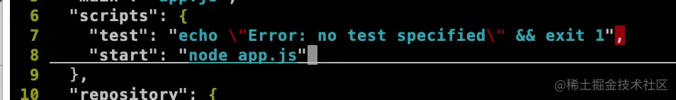 这里我们可以在package.json 中进行修改,如下图第八行所示。