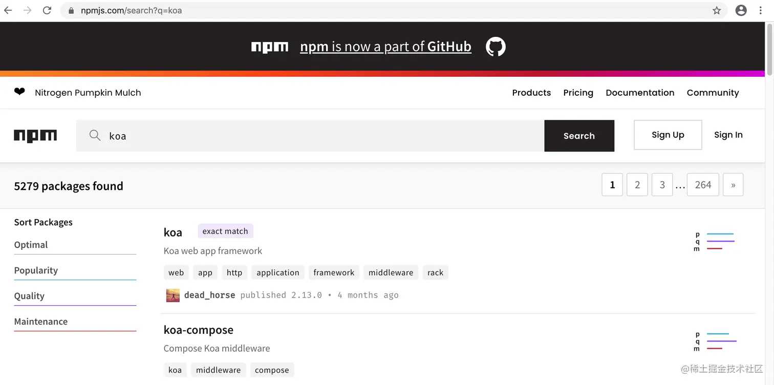 在NodeJS的开发社区中,有一个网站叫做npm registry: www.npmjs.com/。
