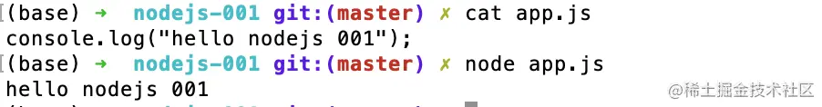 先到这里,上图为第一个nodejs项目的执行效果。这个示例很简单:app.js写了代码调用console.log输出"hello nodejs 001"。