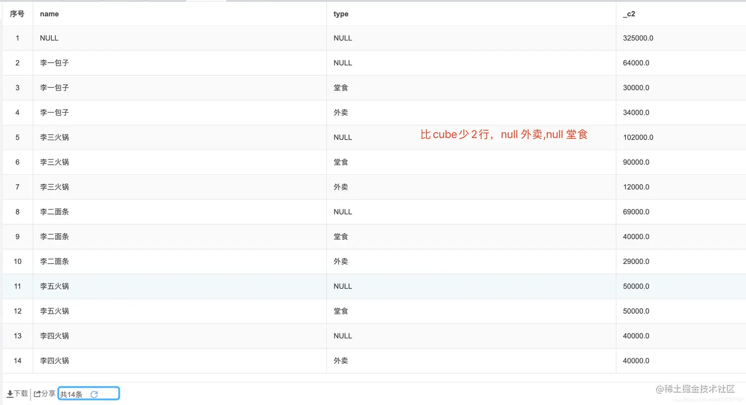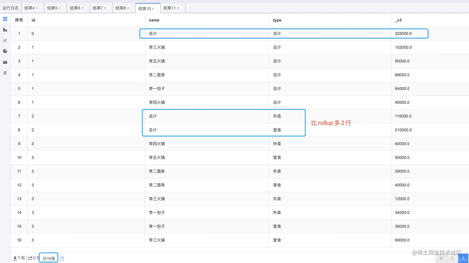 rollup是cube的特例【rollup只group by 第一个字段开头的字段组合】【rullup函数是cube的子集,以最左侧维度为主,按照顺序依次进行聚合.】