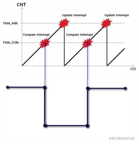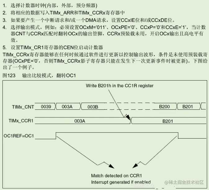 输出比较模式下: CCR = CNT 时,翻转输出电平。
