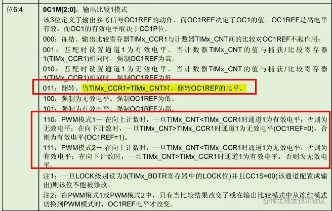 通过CCMR寄存器中的OCM位可以看出来这两种模式的一点区别。