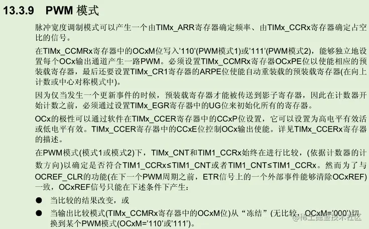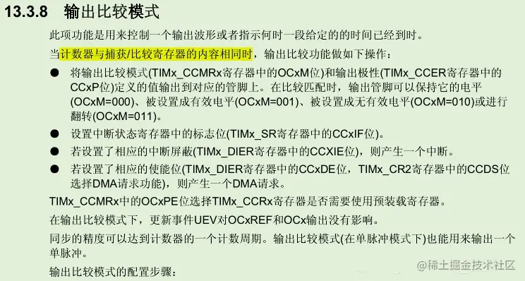 两种模式下最主要的差别就是CCR值代表的含义不一样。PWM模式下CCR可以控制占空比。输出比较模式下CCR可以控制初始相位。