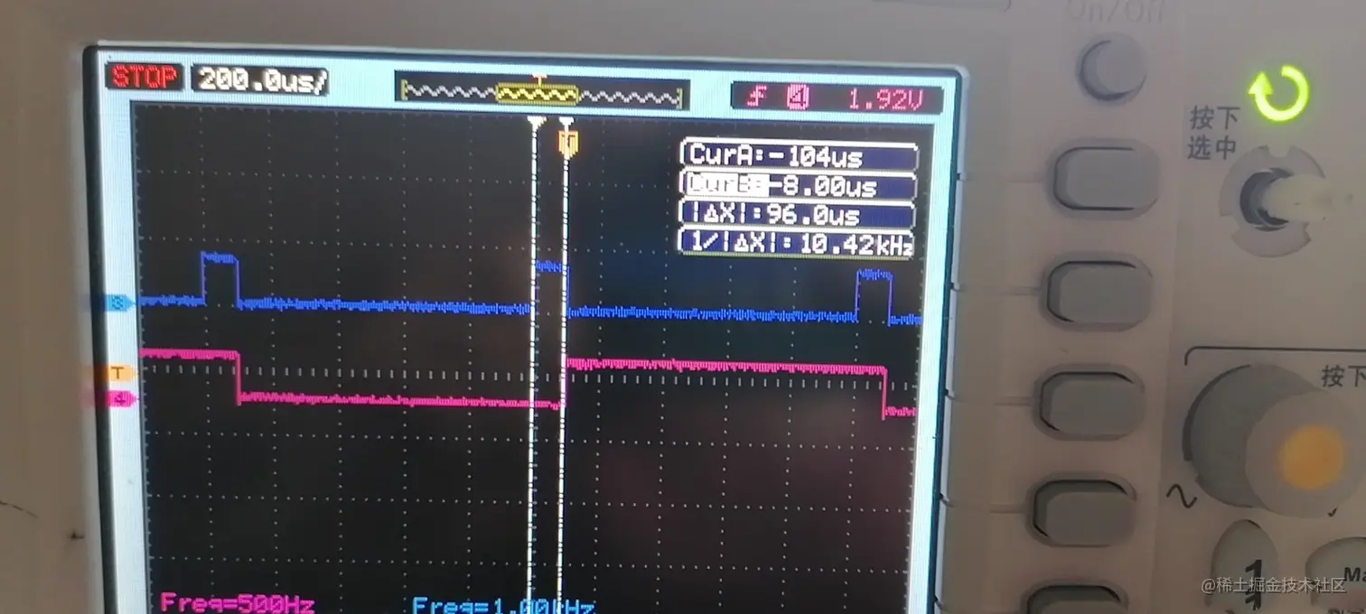 蓝色波形为 PWM模式输出的波形,粉色为输出比较模式输出的波形。可以看到同样的设置参数,PWM输出方波频率为1KHz,输出比较输出的方波为500Hz,说明输出比较模式的频率为PWM模式频率的1/2。
