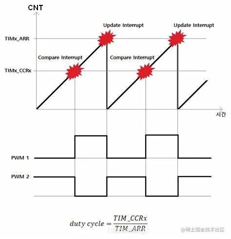 PWM模式下: CNT < CCR时输出一种电平,CNT > CCR时输出相反的电平。