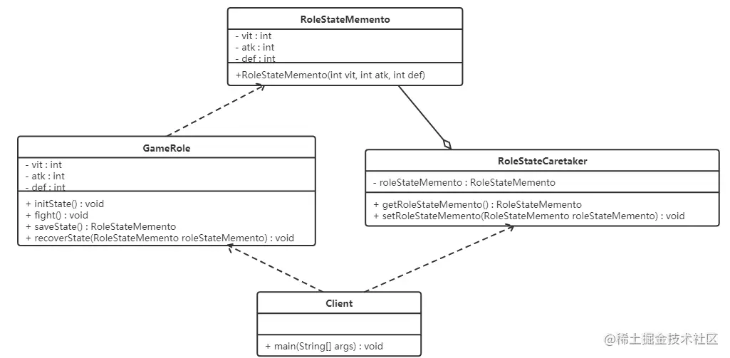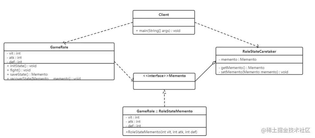 将 RoleStateMemento 设为 GameRole 的内部类,从而将 RoleStateMemento 对象封装在 GameRole 里面;在外面提供一个标识接口 Memento 给 RoleStateCaretaker 及其他对象使用。这样 GameRole 类看到的是 RoleStateMemento 所有的接口,而RoleStateCaretaker 及其他对象看到的仅仅是标识接口 Memento 所暴露出来的接口,从而维护了封装型。类图如下: